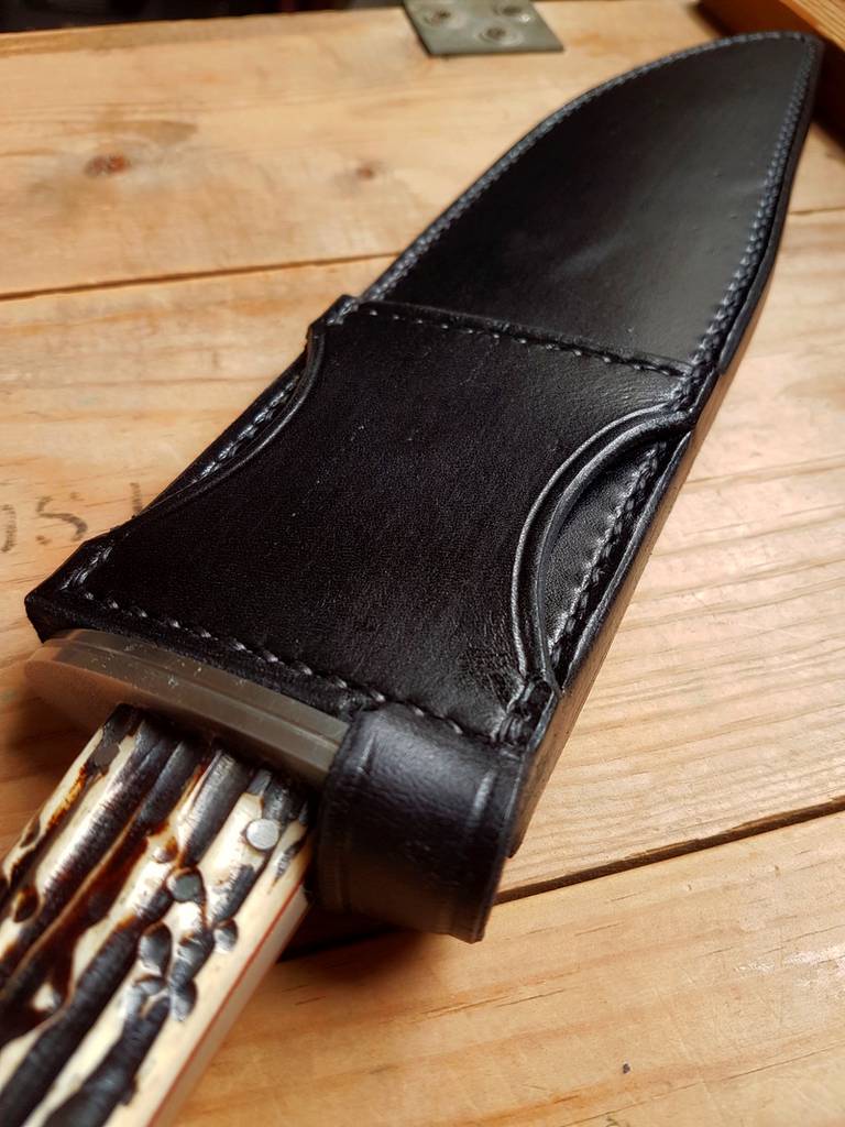 Features: Stainless pins, tapered tang, 416 cross guard, black leather sheath
