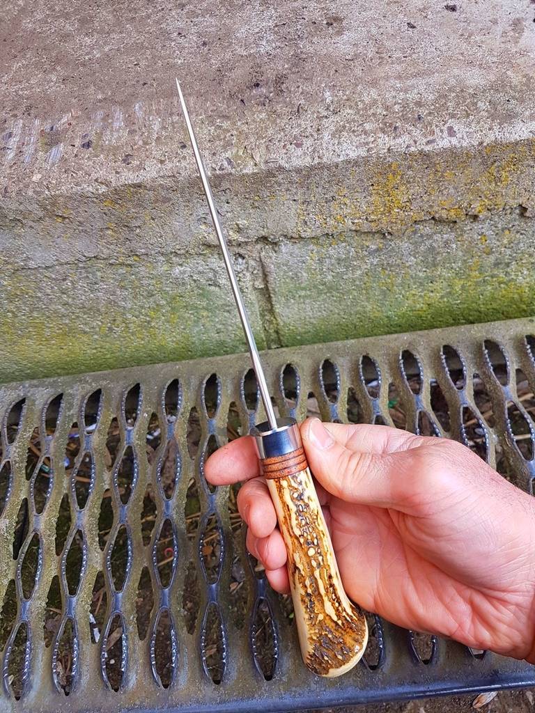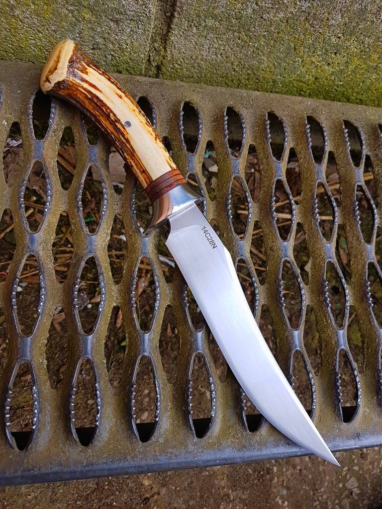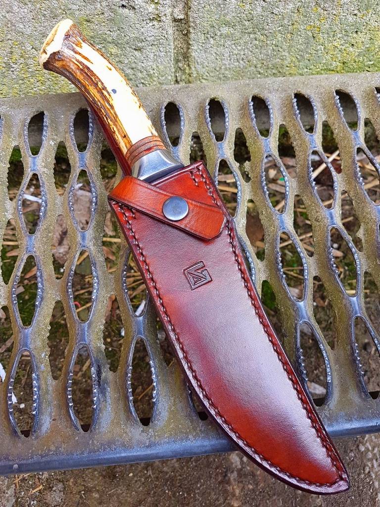 Features: 416 stainless guard, leather spacers, brown leather belt sheath