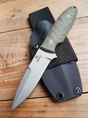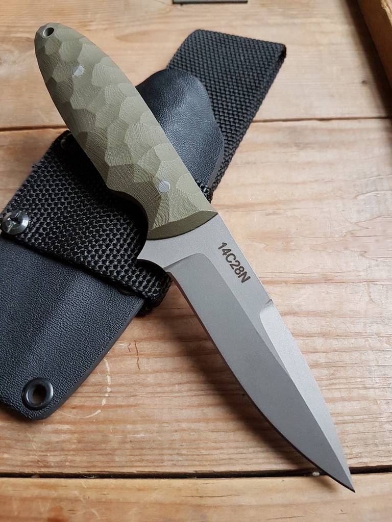 Price: £230 SOLD Tac-1 Tac-1 tactical utility knife, in Sandvik 14C28N and green G10 Model: Tac-1 Blade Length: 3.70" Overall Length: 7.70" Thickness: 4mm Steel: Sandvik 14C28N Handle: Green G10 Features: False top edge, non-reflective matt finish, kydex sheath