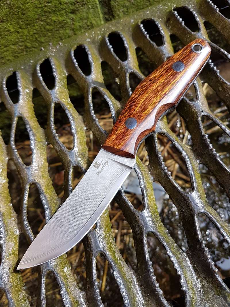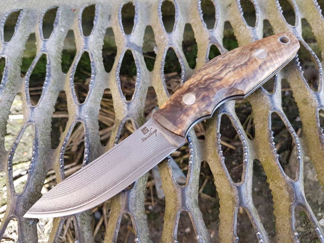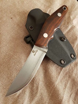A hunting knife for the all-rounder, from paunching rabbits and cleaning trout, to gralloching your trophy stag. GB Hunter Custom Handmade Knife GB Hunter model in Japanese VG10 Suminagashi and desert ironwood